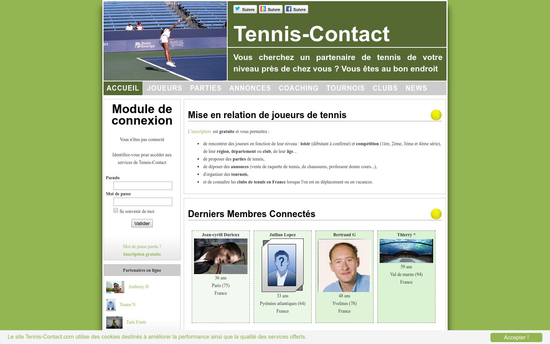Site communautaire de mise en relation de partenaires de Tennis, joueurs de tout niveau, débutant loisir à compétition, proposition de parties, dépose de petites annonces, liste des clubs de tennis en France, liste des terrains de tennis en France...